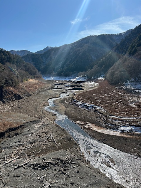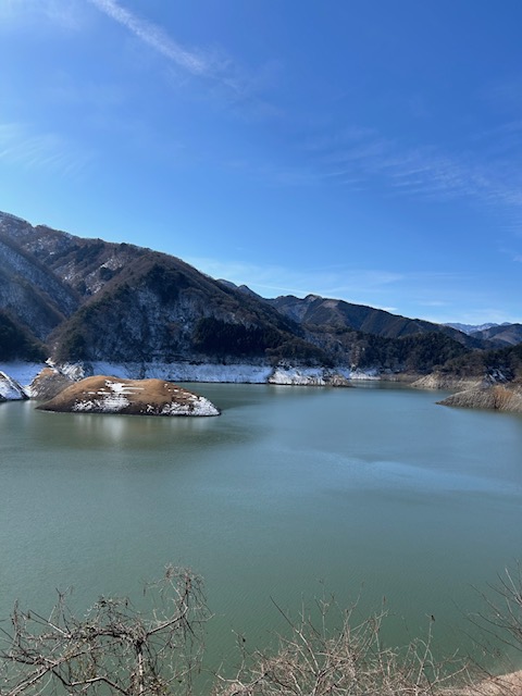 本日、午前中の小河内ダム(奥多摩湖)です。貯水率42.1%と平年に比べて大幅に水位が低くなっています。写真をご覧ください。左側にひょうたん型の小島がご覧になれるでしょうか?豊富に水量があるときはこの小島は水面の下にあります。頭が少し見える時は、本当にひょうたんの形に見えます。この島の姿で、住民の方などは奥多摩湖の貯水率を想像いたします。今は、まさに渇水状態です。普段は湖面のエリアも今は川と化しています。明日の奥多摩町の天気予報は、「雨のち晴れ」ですが、行楽や野外スポーツを予定している皆さまには申し訳ありませんが、何とか一日降り続いて欲しいものです。